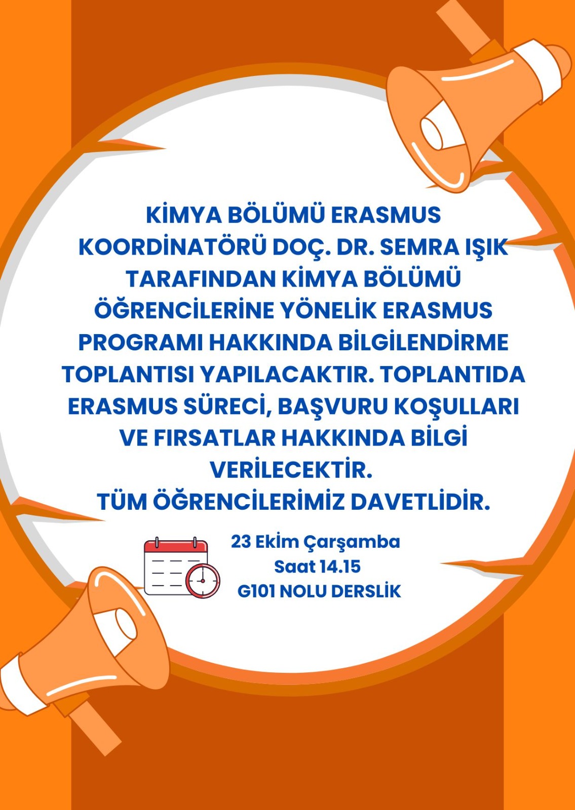 23 Ekim Çarşamba Günü G101 No'lu derslikte,Kimya Bölümü Erasmus Koordİnatörü Doç. Dr.Semra IŞIK tarafından Kİmya Bölümü öğrencilerine yönelİk Erasmus programı hakkında bİlgİlendİrme toplantısı yapılacaktır. Toplantıda Erasmus sürecİ, başvuru koşulları ve fırsatlar hakkında Bilgi verİlecektİr. Tüm öğrencilerimiz davetlidir.